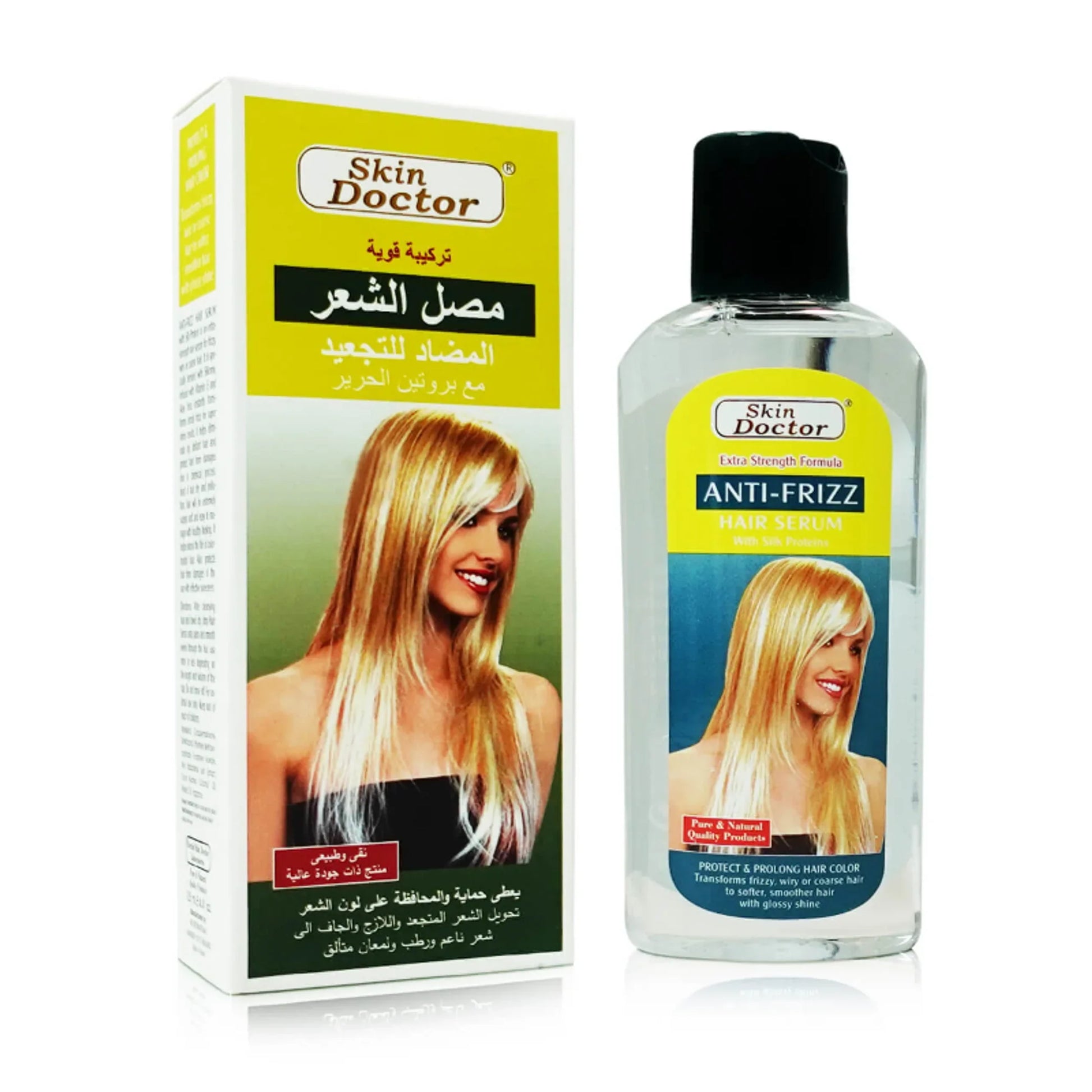 Skin Doctor Anti-Frizz Hair Serum with Silk Proteins is an extra-strength hair serum for frizzy, wiry or coarse hair. It is specially blended with Silicone, infused with Vitamin E and Aloe Vera, instantly transforms unruly frizz for super shiny results. It helps eliminate dry, defiant hair and protect hair from damages due to chemical process, heat and pollution. Hair will be extremely supple, soft and easy to manage with a healthy look. It helps extend the life of color-treated hair. Also protects hair from damages of the sun with effective sunscreen.