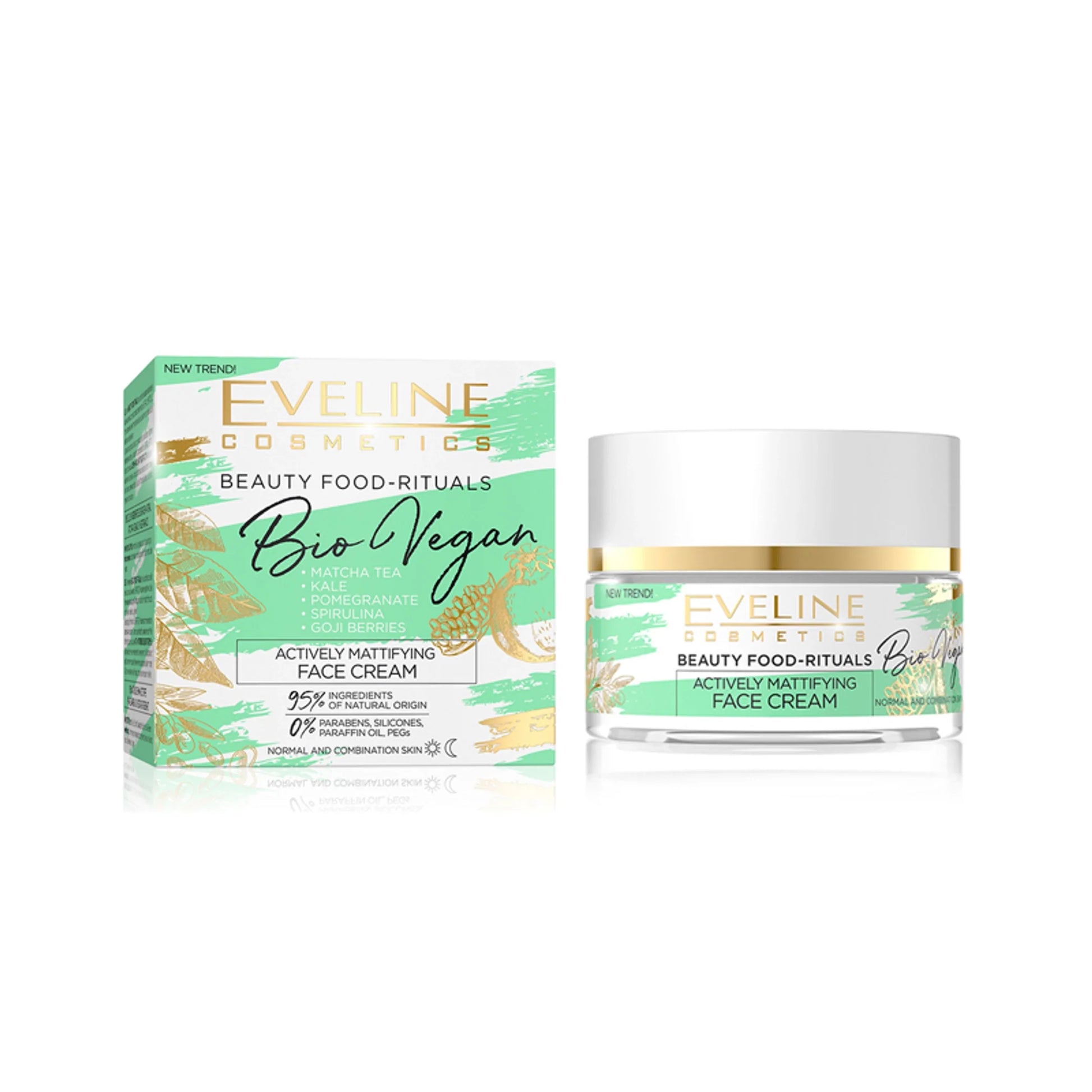 Eveline Cosmetics Bio Vegan Actively Mattifying Day And Night Cream is the health cocktail for the skin, based on the selected SUPERFOOD products. The formulas uses the enormous potential of natural dietary ingredients to "nourish" the skin from the outside. Unique formula enclosing the concentrated dose of anti-oxidants, vitamins, nutrient and mattifying ingredients from SUPERFOODS makes the ACTIVELY MATTIFYING FACE CREAM restore skin balance, regulate sebum secretion, reduce imperfections, tightens pores, prevent shine and revitalise. Ensures the effect of refreshment, smoothing and skin tone enhancement. Active Ingredients: - Matcha Tea: Detoxifying cocktail, invigorates and adds radiance - Kale: Green smoothie, refreshes and smoothens. - Pomegranate: Detoxifying bomb, invigorates and refreshes. - Spirulina: Nutritional Algae, reinforces and moisturizes - Gogi Berries: Source of youth, improves elasticity. 95% Ingredients of Natural Origin Vegan And Vegetarian Friendly