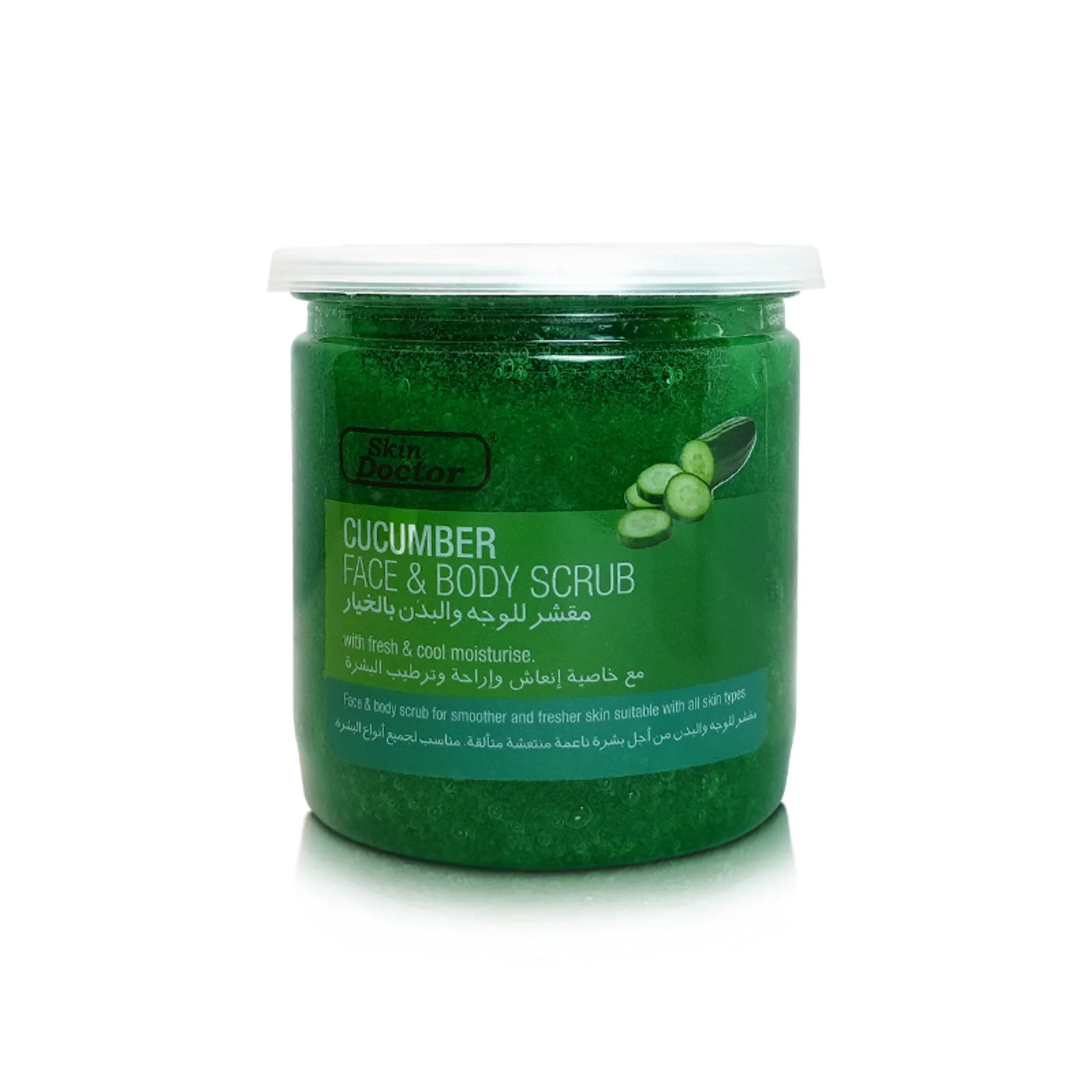 Skin Doctor Cucumber Face & Body Scrub cleans your skin effectively by removal of dead skin cells and leaves skin healthy with a fresh glow. Our unique formula uses natural cucumber to quickly and gently remove dirt and impurities from your skin, leaving it bright, smooth, clear and blemish free.