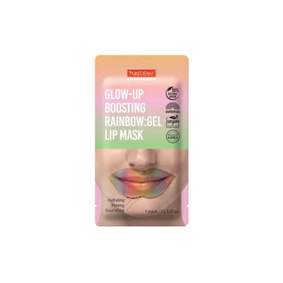 Purederm Glow-up Boosting RAINBOW:gel Lip Mask is a water-soluble hydrogel mask in seven colors, each offering customized care. The mask reacts to skin temperature, melting into the skin for long-lasting hydration and moisture retention. The rainbow ingredients target different concerns, including hydration, firming, and nourishment, with benefits like energizing, brightening, smoothing, and calming based on the color used.