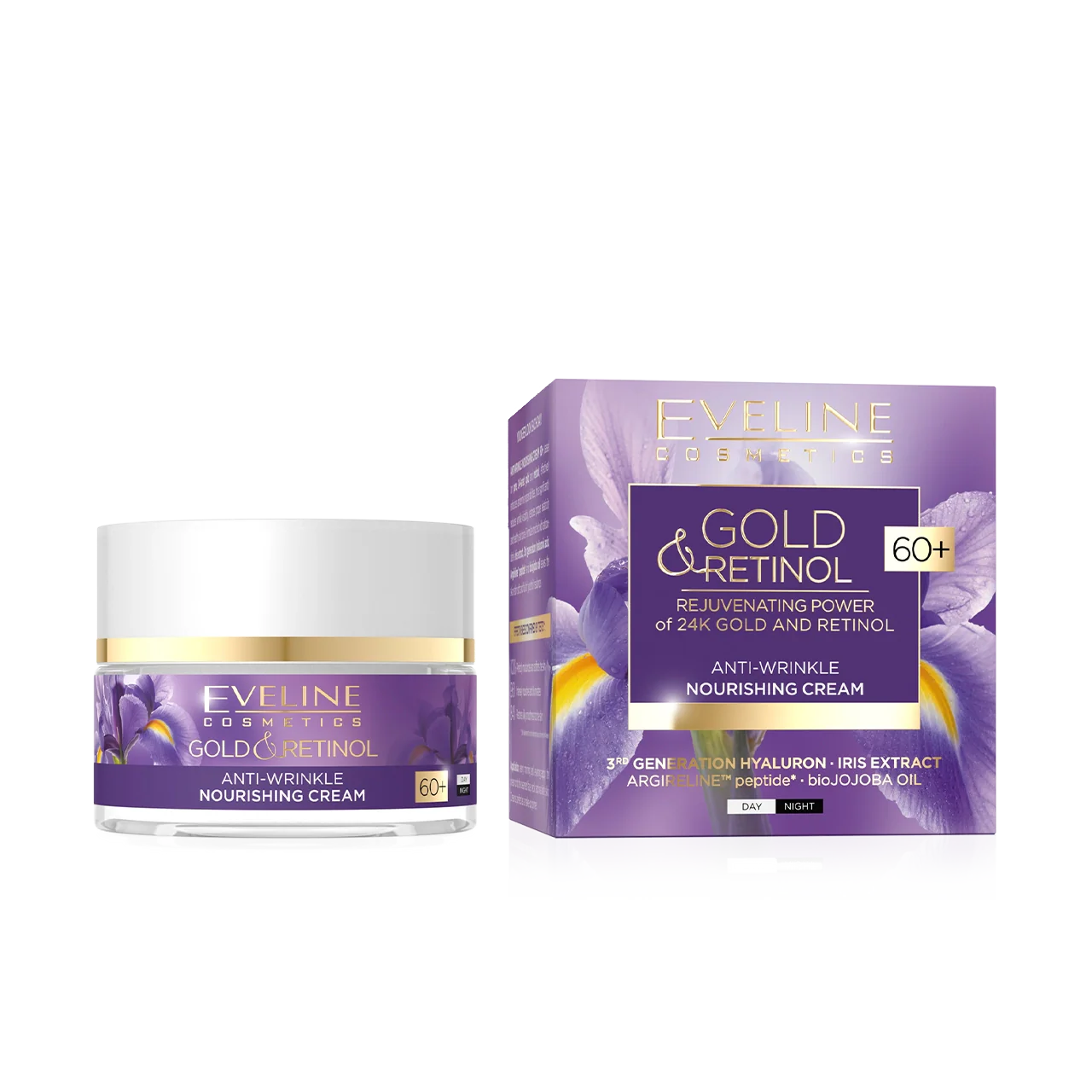 Anti-wrinkle Nourishing Cream 60+ based on pure 24 Karat gold and retinol, effectively enhances epidermis repair abilities, thus significantly reduces wrinkles visibility, restores proper elasticity and healthy skin tone. Formula enriched with antioxidant iris extract, third generation hyaluronic acid, ArgirelineTM peptide and bi-jojoba oil leaves the kin satin soft and full of beautiful radiance. Effectiveness confirmed by tests: 100% perfectly moisturizes and softens the skin. 96% intensely nourishes and illuminates. 84% restores silky smoothness to the skin.