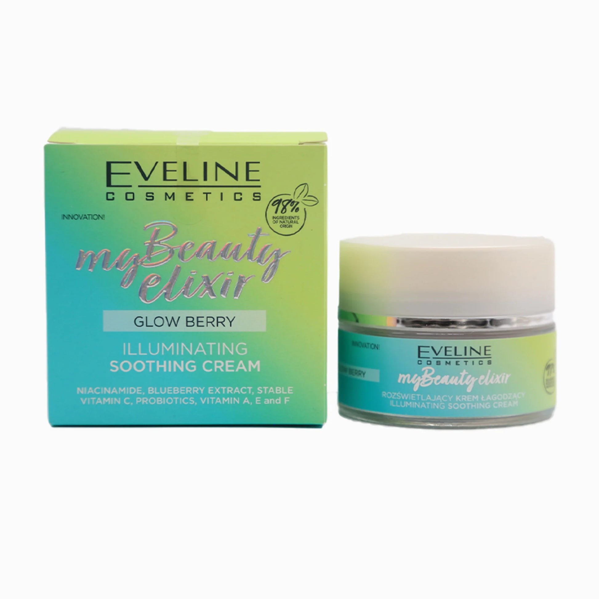Eveline Cosmetics My Beauty Elixir Glow Berry Cream is the Illuminating & Soothing cream that like a magic elixir, immediately soothes, hydrates and smoothens your complexion, ensuring the feeling of comfort and subtle glow. It's light, so perfect for daily skincare, also under make-up. Secret of the effectiveness? This beauty elixir contains the composition of the most carefully selected active ingredients of extraordinary power, without any unnecessary additives weighing down the skin. - Blueberry: Intensely moisturizes and nourishes the skin. - Niacinamide: Reduces imperfections, discolorations and wrinkles. - Probiotics: Protect the skin microflora. - Vitamin C: Evens out skin tone and smoothens. - Vitamins A and E: Reinforce the epidermis and accelerate its regeneration. For whom? For everyone, regardless of skin type.