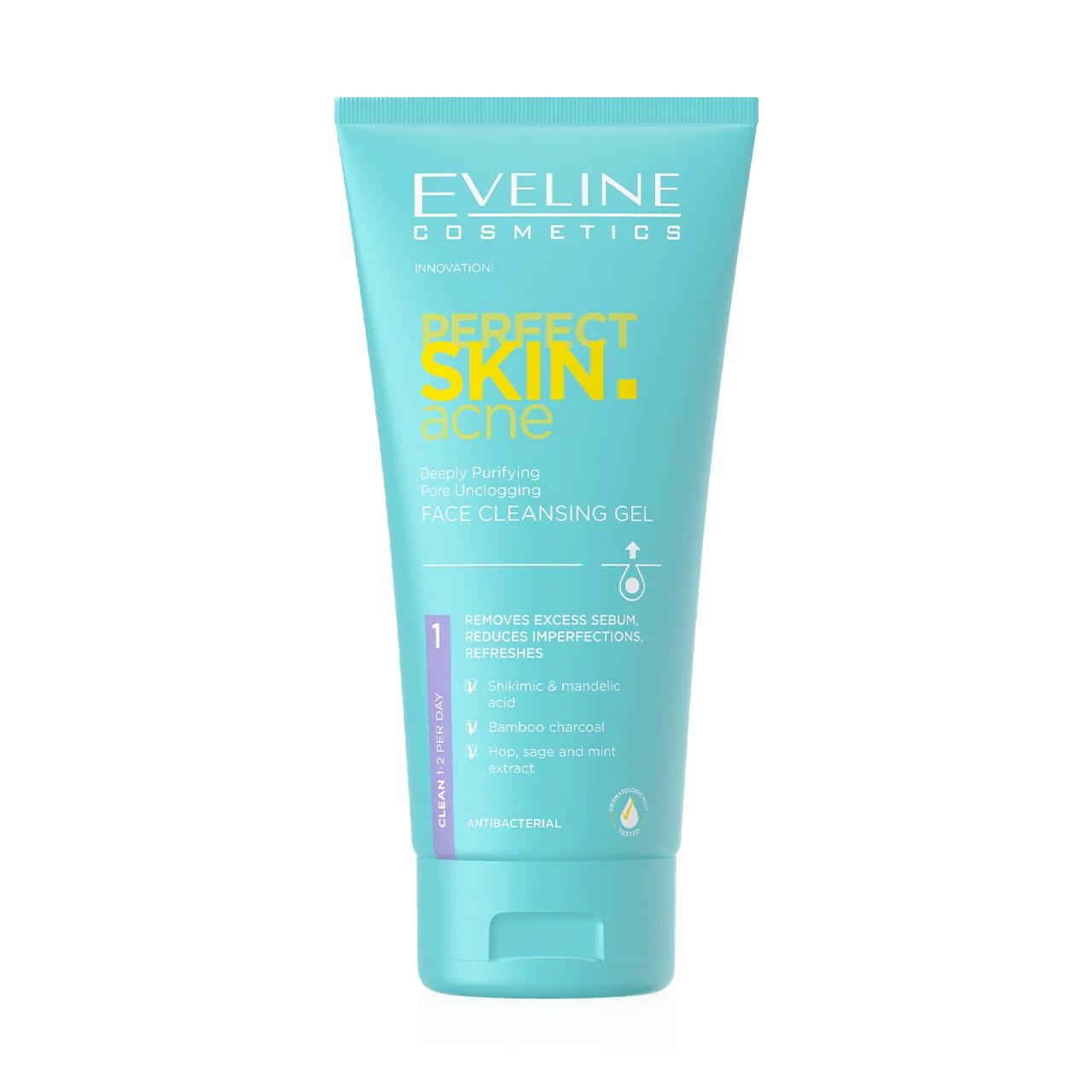 Eveline Cosmetics Perfect Skin Acne Deeply Purifying Pore Unclogging Face Cleansing Gel immediately removes make-up, excess sebum and other impurities from the skin surface, mattifies and prevents formation of imperfections. Ultra effective ingredients: -Shikimik & Mandelic Acid have exfoliating and antibacterial properties, effectievely overcome recurring imperfections. -Bamboo charcoal -Hop, Sage and Mint extract