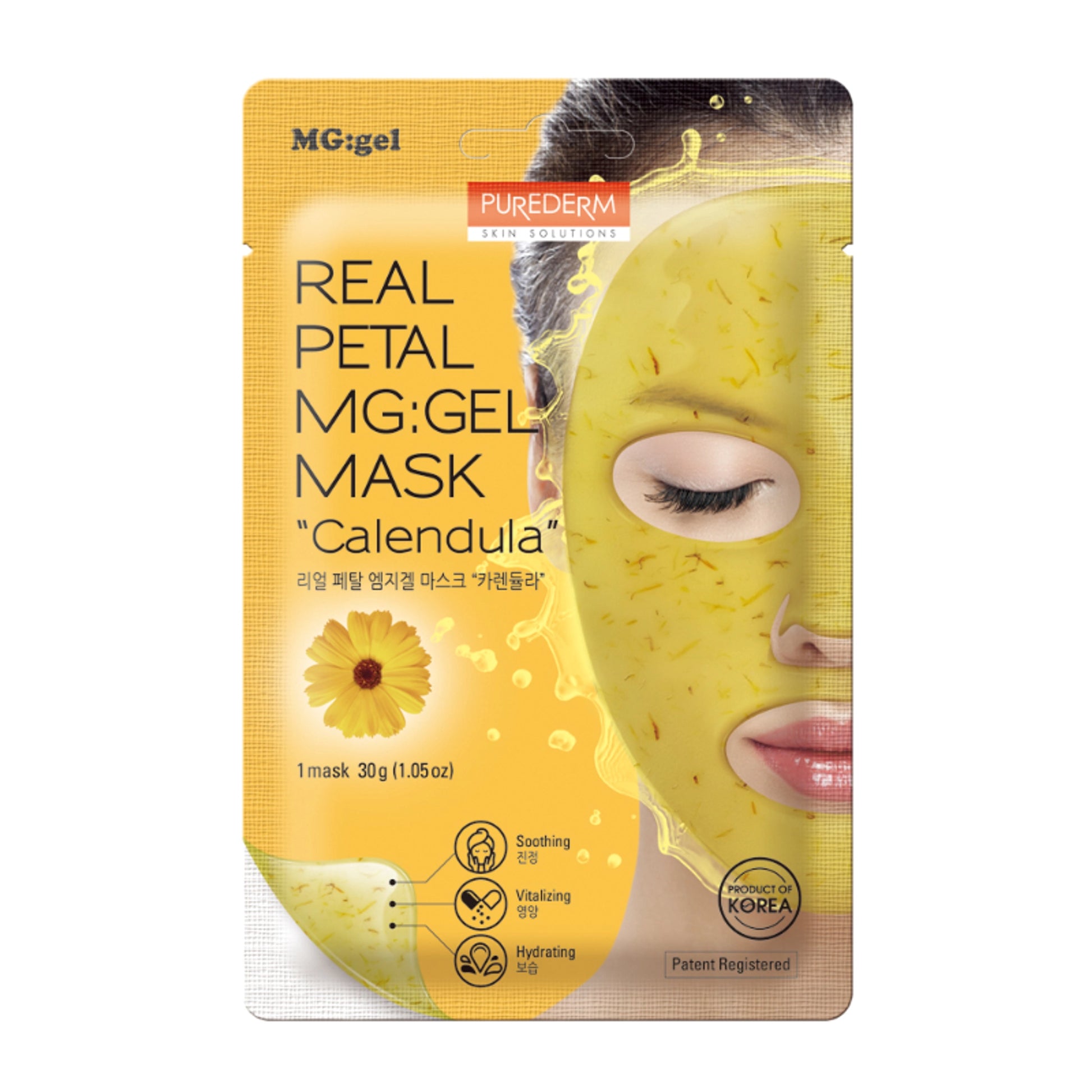 Purederm Calendula Real Petal Gel Mask contains real calendula petals in a patented gel. Calendula petals soothe tired skin. Honey Extract and Hyaluronic Acid supply nutrients and moisture to the skin, promoting moist and healthy skin. It contains a special essence containing real Calendula Extract.