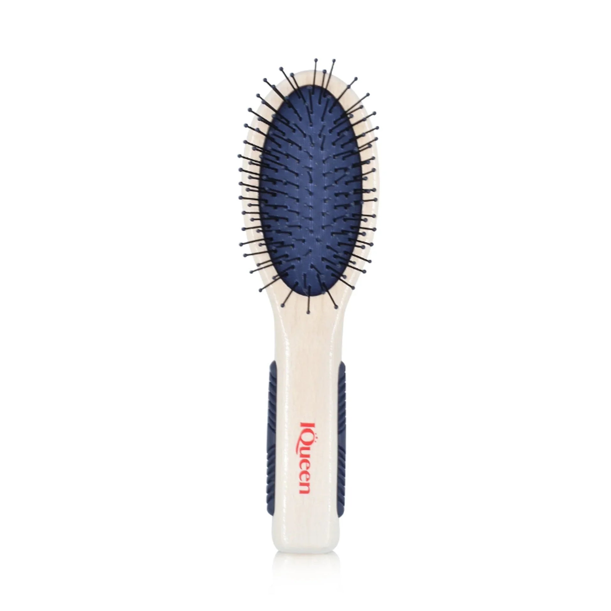 IQueen Styling Tek Detangler Hair Brush Series The sheer whitewashed finish subtly reveals the natural wood grain, while contrasting indigo rubber inserts provide a secure, stylish grip. Flexible nylon bristles with ball tips offer a gentle, pain-free detangling experience for both wet and dry hair. The dense bristle arrangement enhances detangling efficiency and control. Heat-resistant ionic nylon reduces frizz, locks in moisture, and leaves hair with a healthy, shiny finish. Oval Shape, Small Size, Overall Width: 50mm, Length: 175mm
