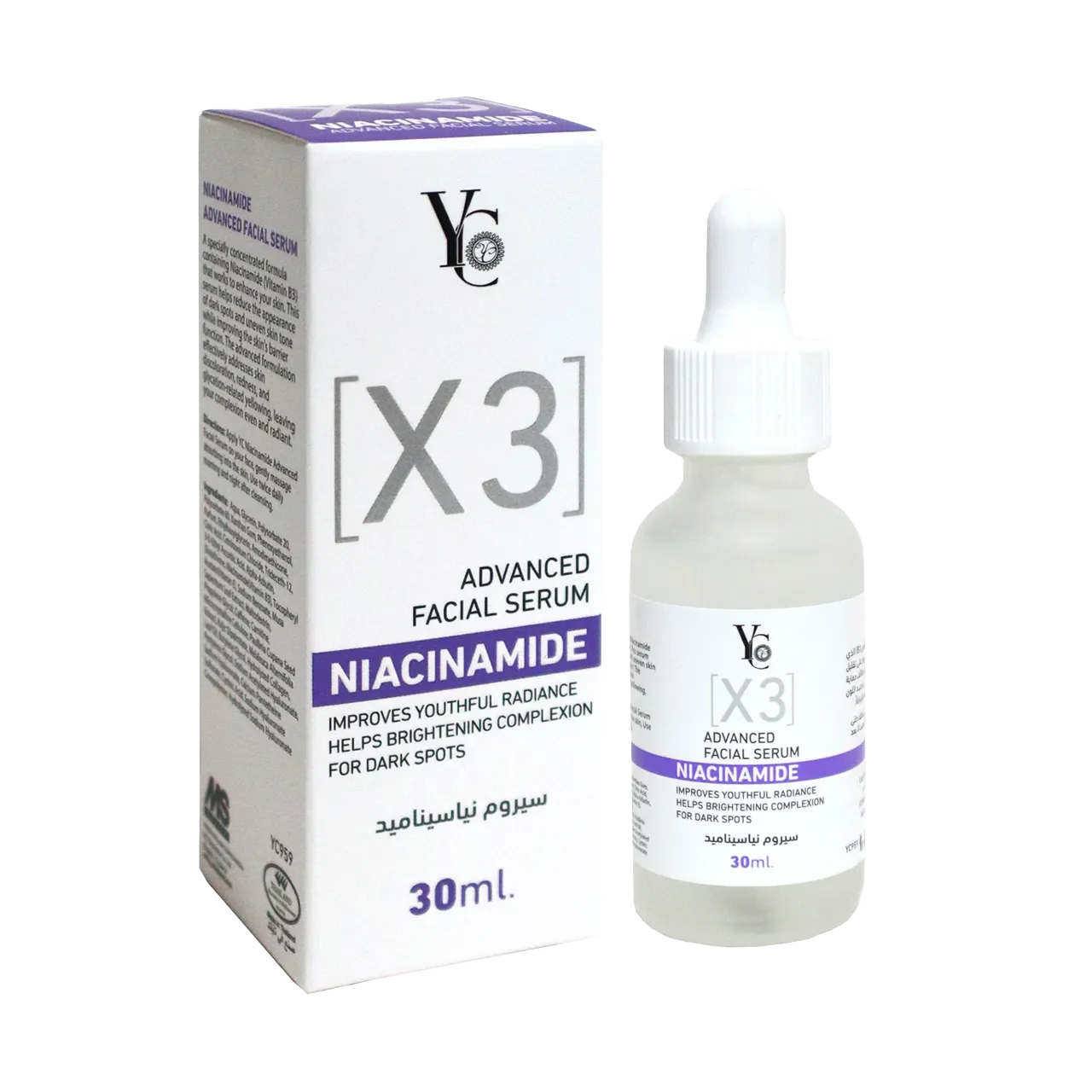 YC X3 Advanced Facial Niacinamide Serum is a highly concentrated formula with niacinamide (vitamin B3) designed to enhance your skin’s appearance. This serum helps reduce the look of dark spots and uneven skin tone while strengthening the skin’s barrier. Its advanced formulation targets discoloration, redness, and glycation-related yellowing, leaving your complexion even and radiant.
