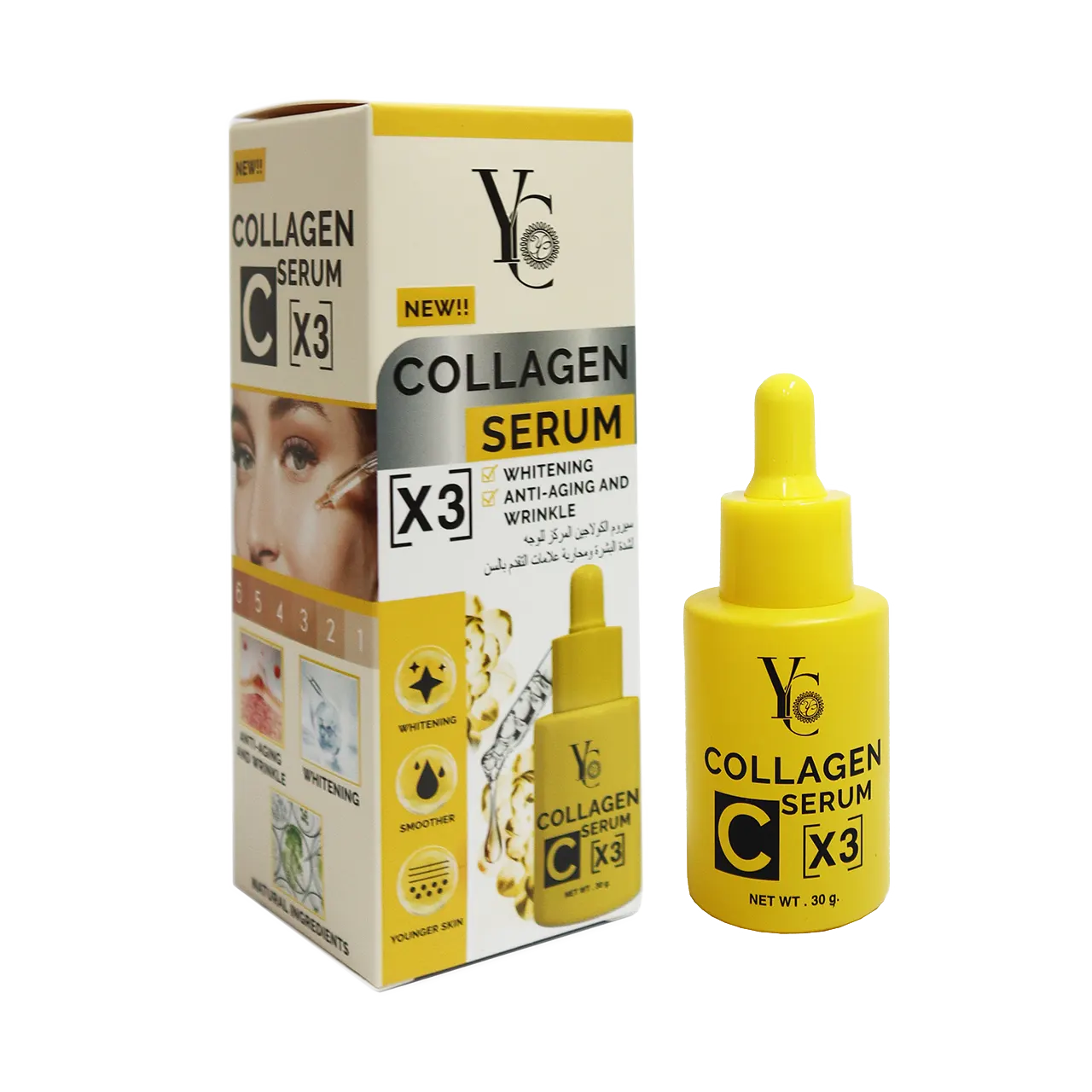 YC X3 Collagen Serum is a specially formulated concentrated serum that contains collagen, promoting a more youthful appearance by moisturizing, improving skin conditions, nourishing, and providing anti-aging benefits. Enhance your skin's whitening effect and achieve smoother skin with the power of natural ingredients.